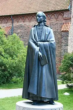 Direkt neben dem leicht abgesenkten Platz vor dem Hauptportal steht eine Bronze-Skulptur für Henric Schartau (1757–1825). Schartau, in Malmö geboren und in Lund gestorben, war Pfarrer und Stadskomminister (Stadtkommissar) und gilt als Begründer der schwedischen Erweckungsbewegung. Die Figur wurde vom Bildhauer Peter Linde geschaffen und im Jahr 2003 aufgestellt.[32]