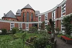 Das Kloster ist baulich mit dem Chor der Kirche verbunden. Der polygonale, ringförmige Bau mit seinen Backsteinfassaden und brutalistisch beeinflussten Traufkanten wurde 1964 bis 1966 durch die Architekten Rau, Bunsmann und Scharf errichtet. Hier gelang eine gute Verbindung zwischen traditioneller und moderner Architektur. Der Bau gestaltete sich schwieriger als erwartet, da ein am Rande des Grundstückes liegender Tiefbunker nicht verändert oder beschädigt werden durfte.