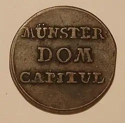 Bis in das Jahr 1790 wurden für das Domkapitel Münster Kupferkleinmünzen geprägt, die auf der Vorderseite meistens ein Knie- oder ein Brustbild des heiligen Paulus trugen. Die letzten 1 und 2 Pfenningemünzen trugen die Aufschrift MÜNSTER/DOM/CAPITUL.[33]