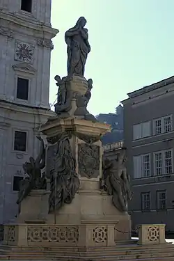 Das Standbild der Immaculata bildet den Mittelpunkt des Domplatzes. Es wurde von Fürsterzbischof Sigismund III. Christoph von Schrattenbach bei den Brüdern Wolfgang und Johann Baptist Hagenauer in Auftrag gegeben und zwischen 1766 und 1771 geschaffen. Die Figur ist eine Kombination aus Untersberger Marmor (Sockelaufbau, Brüstung) und Bleiguss (Figuren, Tafeln, Inschriften). Die Gebrüder Hagenauer griffen bei der Gestaltung des Sockels auf das Modell einer bereits 1711 für Salzburg entworfene Mariensäule von Lucas von Hildebrand zurück, welcher seinerseits darin die Mariensäule Am Hof in Wien zitiert hat.[3]