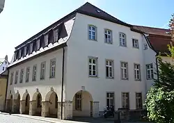 Dass das Straßenbild bestimmende Gebäude ist Teil der Domkurie des Merseburger Doms. Es entstand nach einer am Bau befindlichen Inschriftentafel im Jahr 1573, an der Stelle eines zerstörten Vorgängerbaus. Zur Domstraße hin ist dem zweiflügeligen Gebäude im Erdgeschoss ein Arkadengang vorgelagert. Bemerkenswert ist ein Portal mit Ohrenfaschen, dessen Türblätter üppig beschnitzt sind. In der Zeit des Barock erfolgten umfangreiche Veränderungen, 1939 wurde der Bau im Stil der damaligen Zeit rekonstruiert.