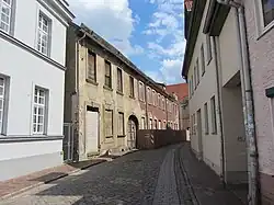 - Zur Domstraße steht das zweigeschossige giebelständige verputzte klassizistische Fachwerkhaus mit einer Attika, die durch seine markanten ovalen Ochsenaugen auffällt. 1788 hatte das Haus zur Domstraße im Obergeschoss eine Beletage mit Parkettboden, repräsentativen Türen und einem Saal.