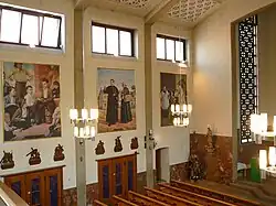 Umso reichhaltiger ist die künstlerische Ausstattung der Kirche: Die Fensterrose im Chor der Kirche zeigt ein Glasfenster mit der Apotheose des Hl. Don Bosco. Im Kirchenschiff befinden sich an den Wänden der Längsseite unter den Kirchenfenstern, die in der Tradition der Obergaden im oberen Teil der Wand angeordnet sind, je drei Gemälde, die Szenen aus dem Leben des Hl. Don Bosco darstellen. Verdeutlicht wird in diesen Szenen die Abkehr Don Boscos von der in seiner Zeit vorherrschenden repressiven Erziehung hin zu einer Pädagogik der Menschlichkeit, des Vertrauens und der Nächstenliebe.[14] Weitere Kunstgegenstände wie eine Marienstatue am linken Abschluss des Kirchenschiffs oder eine Bronzestatue des Hl. Don Bosco bereichern die Innenausstattung der Kirche. Die Wände des Gotteshauses sind im unteren Bereich mit Marmor ausgestattet.