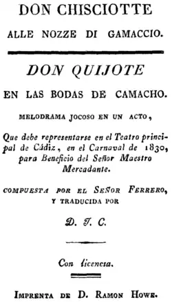 ![]() Titelblatt des Librettos, Cádiz 1830 | |