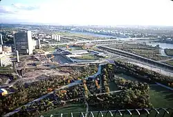 Ende der achtziger Jahre erwog Wien gemeinsam mit Budapest im Jahr 1995 eine Weltausstellung auszurichten. Am 14. Dezember 1989 erhielt man für dieses Vorhaben den Zuschlag. Die Expo 95 sollte demnach von 29. April bis 26. Oktober 1995 stattfinden.[4] Als Ausstellungsgelände wurde der Bereich „Donauraum – Konferenzzentrum“ (ca. 50 ha) definiert. Die Nachnutzung des damals noch kontaminierten und alluvialen Stück Lands wurde als entscheidender Faktor der Expo-Planung bestimmt.[5] Das Gelände sollte im Anschluss an die Weltausstellung gänzlich in die gegebene Stadtstruktur integriert werden.[6] Am 30. März 1990 wurde hierfür ein Leitprogramm für die städtebauliche Entwicklung beschlossen. Die Gestaltung des Ausstellungsgeländes sollte dabei auf Grundlage eines von der (1989 gegründeten) Expo-Vienna AG ausgelobten Architektenwettbewerbs erfolgen. Auf temporäre Bauten größeren Ausmaßes sollte verzichtet werden.[7] Der Wettbewerb „Bebauungs- und Gestaltungskonzepte EXPO 95 in Wien und Nachnutzung“ wurde bis Ende 1990 abgehalten.[8] Teilnahmeberechtigt waren Architekten aus Österreich, aus Ungarn und ausgewählte internationale Architekturbüros, ferner wurden auch Studierende eingeladen, sich zu beteiligen. Aus insgesamt 84 Projekten (65 von Architekten und 19 von Absolventen) wurde das von Sepp Frank und Rudolf Zabrana ausgewählt.[9] Entgegen ursprünglichen Plänen, die einstige Deponie mit einer Platte zu versiegeln, wurde sie schließlich vollständig ausgehoben. Diese Begleitmaßnahme der Expo-Vorbereitungen umfasste einen Aushub von insgesamt rund 965.000 Tonnen Material, davon 240.000 Tonnen Hausmüll aus der Nachkriegszeit bis 1963/64.[10][11] Im Zuge einer aus politischen Gründen durchgeführten Volksbefragung vom 14. bis 16. Mai 1991 sprachen sich 64,85 % der Befragten gegen die Abhaltung der Expo aus, ungeachtet breiter Unterstützung durch Politik, Medien und Wirtschaftskreise. Infolgedessen zog die Republik Österreich die Bewerbung für den Standort Wien in der Generalversammlung des BIE am 5. Juni 1991 wieder zurück.[12]