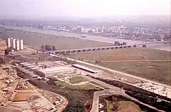 - 1976/1977: Der Donaupark ist wie heute vorhanden. An der heutigen Ecke Donau-City-Straße/Marcel-Prawy-Promenade ist die 1964 errichtete, 1966 als Eishalle eingerichtete und 1991 abgerissene Donauparkhalle zu finden. Das Areal direkt an der Wagramer Straße ist leer. Die neue Reichsbrücke ist in der Errichtung, nördlich davon führen Behelfsbrücken für Straßenbahn und Autos über die Donau. Die Straße als Begrenzung zum Überschwemmungsgebiet heißt Am Hubertusdamm.[24]