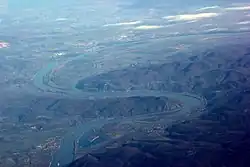 Nach einer kurzen Nordwendung bei Esztergom folgt ein leicht nach rechts gekrümmter Verlauf bis zur Mündung der Ipeľ. Danach bahnt der Fluss sich seinen Weg mit einer scharfen S-Kurve durch das Visegráder Gebirge. Diese eindrucksvolle Talenge ist bei Touristen und als Fotomotiv beliebt. In der flussabwärts daran anschließenden Biegung wendet sich der Fluss erst wieder nach Osten und dann nach Süden. Sie macht mit Blick auf die Europakarte das Knie aus, hat aber einen großen Kurvenradius. Das Tal ist dort breit, und der Fluss spaltet sich in einen Hauptarm am Prallhang und einen Nebenarm am Gleithang, die sich erst am Stadtrand von Budapest wieder vereinigen. Vác liegt am Prallhang. Zwischen beiden Armen liegt die lang gestreckte Insel Szentendre Sziget.
