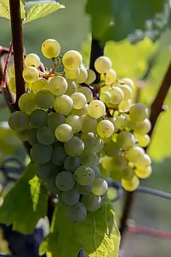 - Der Traubenstiel ist mittellang (3–5 cm). Die Trauben sind mittellang (14–18 cm) und lockerbeerig, zum Teil auch etwas dichtbeeriger. Die Grundtraube ist zylindrisch und hat 1 bis 3 Flügel, die Beitraube fehlt oder ist bis mittelgroß. Die Beeren sind rund bis oval (Länge: 13–15 mm, Breite: bis zu 13 mm). Das Einzelbeerengewicht ist vergleichsweise gering (bis zu 2 Gramm). Die Beerenhaut ist grün-gelb gefärbt und das Fruchtfleisch ist ungefärbt.