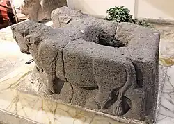 Das Monument aus Basalt ist 1,20 Meter lang, 0,84 Meter breit und vorn 0,60 Meter hoch. Auf dem Rücken der Stiere ist ein Loch von 0,46 Meter Breite, 0,40 Meter Länge und 0,20 Meter Tiefe eingelassen, das zur Aufnahme des Zapfens einer Statue diente. Die hintere Seite ist glatt, wie bei mehreren bekannten Basen aus Karkemiš, was zur Annahme führt, dass die Basis nicht frei, sondern an einer Wand aufgestellt war. Die Köpfe der beiden Tiere sind als Rundplastik, die Seitenansichten im Relief ausgeführt. An den Köpfen fehlen die Hörner und einige hervorstehende Teile sind beschädigt. Dennoch lassen sich verschiedene Details noch gut erkennen. Zwischen den Hörnern war ein Ornamentband befestigt. Die Augen sind ebenso wie die angelegten Ohren detailreich ausgearbeitet, Maul und hervorstehende Nüstern dagegen sind beschädigt. Die Stiere sind in Bewegung mit den inneren Vorderbeinen nach vorn dargestellt. Die Vorderbeine sind im Relief von der Seite zu sehen, wobei die Oberschenkelmuskeln bis zur Schulterhöhe der Tiere reichen. Dabei sind diese im flachen und die Unterschenkel im Hochrelief gearbeitet. Gleiches gilt für die Hinterbeine. Die realistisch gespaltenen Hufe sind durch eine waagrechte Doppelfurche vom Bein getrennt, dahinter ist eine Art Sporn erkennbar. Zwischen den beiden Hinterbeinen, von denen das jeweils äußere vorgestellt ist, hängt der Schwanz herab, er endet in einer quastenartigen Verzierung. Dahinter sind Teile des Geschlechtsorgans zu sehen.