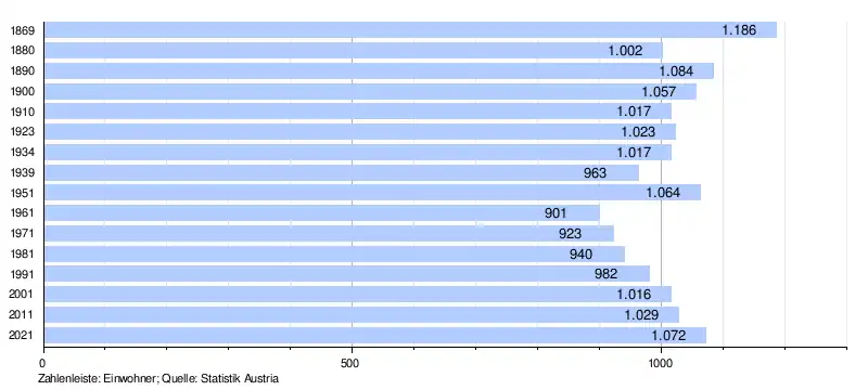 Seit einem Tiefstand von 901 Einwohnern im Jahr 1961 steigt die Bevölkerungszahl konstant. Die seit 1981 negative Wanderungsbilanz wird durch eine positive Geburtenbilanz aufgehoben.[4]