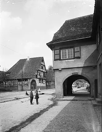 ![]() (Fotograf: Wilhelm Kratt, 1910) Die Dorfbach in der Mitte der Blankenlocher Hauptstraße, dahinter das Gleis des Lobberles. Vorne Blankenlocher Rathaus, hinten Kerns-Max-Haus. | ||