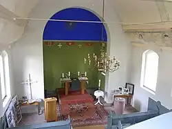 In der rechten Deckenwölbung waren fünf Engelsköpfe gemalt, die mit Margeriten und Gänseblümchen umkränzt waren. Durch spätere Bauarbeiten gingen zwei Motive unwiederbringlich verloren. Die Motive der linken Seite sind noch nicht wieder vollständig zu sehen, so dass noch nicht festgestellt werden konnte, was hier erhalten geblieben ist. Über beiden Motivbändern lag früher ein Wolkenkranz. Zudem sind quer zum Kirchenschiff Motivbögen gemalt, die den Eindruck hervorrufen sollten, dass die Decke mit Stuckornamenten verziert ist. Drumherum war ein Sternenhimmel.
