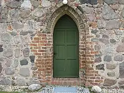 Daran schließt sich nach Westen der Kirchturm an. Er hat einen quadratischen Grundriss mit einer Seitenlänge von 5,40 m und ist gegenüber dem Schiff eingezogen. Im unteren Bereich verwendeten die Handwerker große und unbehauene Feldsteine. Er kann von Westen her über ein spitzbogenförmiges Portal betreten werden. Dessen Laibung ist aus rötlichem, der Scheitel aus gelblichem Mauerstein errichtet. Nördlich ist ein kleiner Anbau über der Nordtür, das zu einer früheren Zeit vermutlich das Priesterpforte war. In etwa auf der halben Traufhöhe wechselt das Material der Ecksteine. Sind es im unteren Bereich ebenfalls Feldsteine, wurden darüber Mauersteine verwendet. Im Glockengeschoss sind an den vier zugänglichen Seiten je eine gedrückt-segmentbogenförmige Klangarkade. Darunter ist an der Ostseite die Westwand eines nicht mehr vorhandenen Giebelturms erkennbar. Der Turm schließt mit einem schlichten, quergestellten Walmdach ab.