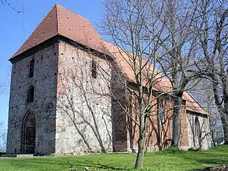 Der Kirchturm hat ein gewaltiges Untergeschoss aus Feldstein. Das niedrigste Gebäudeteil ist der zuerst errichtete Chor. An seiner Giebelseite befindet sich ein spitzbogiges großes Fenster, das allerdings erst 1845 in der heutigen Form eingefügt wurde. Auch die Fenster des Kirchenschiffes sind spitzbogig ausgeführt.