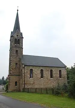 Die im örtlichen Denkmalverzeichnis eingetragene Kirche entstand im Jahr 1864 aus Bruchsteinen im Stil der Neoromanik. Der schlanke Kirchturm befindet sich westlich des Kirchenschiffs und ist zum Teil in das Schiff eingezogen. Bedeckt wird der auf einem quadratischen Grundriss stehende Turm von einem Spitzhelm. Das Kirchenschiff ist langgestreckt, am Ostende befindet sich die Apsis. Der Zugang zur Kirche befindet sich auf der Westseite. Die zweiflügelige Kirchentür ist mit aufwendigen Beschlägen versehen und stammt aus der Bauzeit der Kirche.