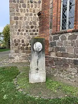 Südöstlich des Bauwerks steht ein Grabstein, der an den 1881 verstorbenen Altkünkendorfer Bildhauer C. F. Müller erinnert. Der am 22. Mai 1815 geborene Künstler plante eine Beteiligung an einer Weltausstellung in Paris. Nachdem er seinen Plan nicht realisieren konnte, wurde er „gemütskrank“[8] und verstarb.
