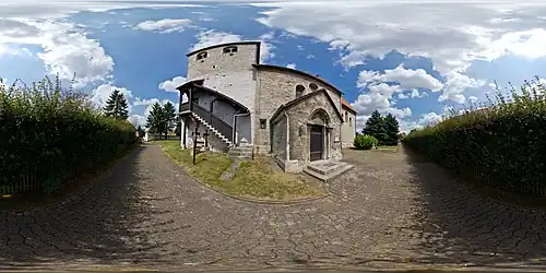 Ähnlich wie auch bei anderen Kirchen der Gegend führt eine Außentreppe zu einer Empore im Turminneren. Der Turm ist mit zahlreichen Schallöffnungen versehen.