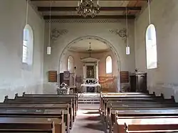 Im Südosten befindet sich die hölzerne Kanzel. Ein runder Triumphbogen ist mit Malerei verziert. Unter der Westempore befindet sich ein abgeschlossener und beheizbarer Raum, der als Winterkirche genutzt wird. Die sechsregistrige Orgel, erbaut 1960/1961, steht seit 2012 auf der Empore. Sie stammt als Schenkung aus der profanierten Heilig-Kreuz-Kirche in Schulenburg.[7]