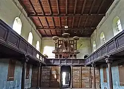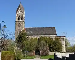 Die heutige Dorfkirche entstand während der Gründerzeit im Jahr 1875 und wurde vom Naumburger Architekten Johann Gottfried Werner geplant. Der Vorgängerbau stammt aus dem 13. Jahrhundert. Ein eigener Pfarrer wird für die Kirche erstmals im Jahr 1409 erwähnt. Das Patrozinium ist heute nicht mehr bekannt.[2] Die Kirche ist ein Natursteinbau mit einem Westquerturm. Über mehrere Jahre war das Gebäude dem Verfall ausgesetzt, heute ist es gesichert.[3]