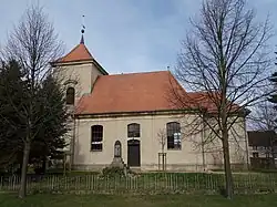 Die 1743 erbaute Saalkirche besitzt mit Lisenen gegliederte Putzfassaden. Sie besteht aus einem Langhaus mit drei Fensterachsen, einem eingezogenen, gerade geschlossenen Chor im Osten und einem Kirchturm auf quadratischem Grundriss im Westen, der mit einem Pyramidendach bedeckt ist. In seinem Glockenstuhl hängen drei Kirchenglocken. An der Südseite des Langhauses befindet sich das Portal, das an der Nordseite ist zugesetzt.
