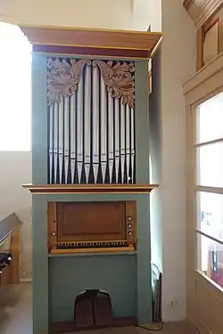 Die Kirchenausstattung stammt einheitlich aus der Mitte des 18. Jahrhunderts. Dies umfasst einen hölzernen Kanzelaltar mit seitlichen Aufgängen, die mit reichem Schnitzdekor und Skulpturen von Jesus Christus und Moses verziert ist. An der Kanzel selbst sind zwei Allegorien angebracht; auf dem Schalldeckel eine Engelswolke mit Strahlenkranz. Das Patronats-, Pastoren- und Gemeindegestühl wurde mit Blenden gegliedert und mit toskanischen Säulchen verziert. Die Baldachine der Patronats- und Pastorenstühle erhielten zusätzlich ein geschnitztes Rocailledekor. Die Ausstattung ist in weiß-gelblichen Farbtönen gehalten und wird im Dehio-Handbuch als „sehr stimmungsvoll“ bezeichnet. Das Bauwerk trägt im Innern eine Balkendecke. Im Westen steht eine Orgelempore, die im Mittelteil vorkragend ist und jüngeren Datums sein könnte.