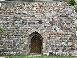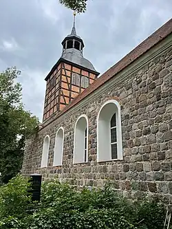Das Bauwerk entstand im Wesentlichen aus Feldsteinen, die überwiegend behauen und lagig geschichtet wurden. Der Chor ist gerade und nicht eingezogen. Am Chorschluss befinden sich zwei große rundbogenförmige Fenster, deren Faschen verputzt und teilweise mit rötlichem Mauerstein umfasst wurden. Mittig ist eine schmale und ebenfalls rundbogenförmige Vertiefung, die zu einer früheren Zeit Teil einer Dreifenstergruppe war und mittlerweile als Blende ausgeführt ist. Im ebenfalls aus Feldsteinen errichteten Giebel ist mittig ein Ochsenauge.