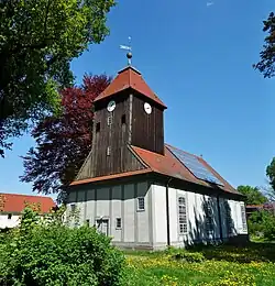 Die Saalkirche wurde 1704 erbaut. Sie besteht aus einem Langhaus aus verkleidetem Holzfachwerk mit Fünfachtelschluss im Osten, aus dessen Satteldach sich im Westen ein quadratischer, verbretterter Dachturm erhebt, der die Turmuhr und den Glockenstuhl beherbergt, und der mit einem Pyramidendach bedeckt ist. Der Innenraum ist mit einer verputzten Flachdecke überspannt, die von Robert Sandfort bemalt wurde. Auf der Empore steht eine Orgel mit acht Registern, einem Manual und einem Pedal, die 1888 von Albert Hollenbach gebaut wurde.[1] Zur Kirchenausstattung gehören ein Kanzelaltar aus der Bauzeit, dessen Kanzel von Säulen flankiert wird, und ein schwebender Taufengel.