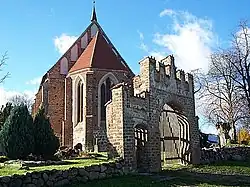 Die Kirche ist aus Backstein auf einem etwa 1,6 Meter hohen Feldsteinsockel. Sie wurde im 14. Jahrhundert erbaut. Im Osten ist ein Chor angebaut, der als Oktogon angelegt ist und von einem Gewölbe geschlossen wird. Nördlich an den Chor ist eine Sakristei mit Kreuzgewölbe angebaut. Um den Chor verläuft ein Gesimsband mit Hohlkehle und Stab. Das rechteckige, zweijochige Kirchenschiff hat eine flache Holzdecke. Den Chorabschluss zum Kirchenschiff bildet ein gotischer Triumphbogen mit einem wulstigen Profil. Im Chorraum gibt es drei zweiteilige und ein dreiteiliges Fenster mit Spitzbogen. Auf der Nordseite des Langhauses sind die ursprünglichen vierteiligen Fenster erhalten, in der Südwand wurden zusätzliche Stützpfeiler angebracht, so dass dadurch ein Fenster halbiert und eines lediglich dreiteilig geblieben ist. Weitere 14 Stützpfeiler aus Backstein sind um den Bau verteilt. Das ehemalige Portal auf der Nordseite weist in seiner Laibung abwechselnde Hohlkehlen und birnenförmige Stäbe auf. Als Schmuck finden sich in der Krönung des Spitzbogens Lilien und Krabben aus Backstein. Das heutige Westportal ist auffallend hoch und mit fünf Rundstäben und vier dazwischenliegenden Wandgliedern in der Laibung verziert. Auf dem mit sieben gotischen Blenden verzierten Ostgiebel sitzt ein Dachreiter.