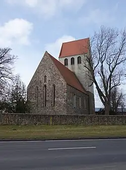 Das Bauwerk ist eine stattliche Saalkirche aus regelmäßigem Feldsteinmauerwerk mit etwas breiterem Westquerturm aus der zweiten Hälfte des 13. Jahrhunderts; der verputzte obere Turmteil mit Satteldach wurde im Jahr 1909 erneuert. Im 18. Jahrhundert wurden die Südvorhalle angebaut und die Fenster mit Ausnahme der Dreifenstergruppe im Osten verändert. Im Süden wurde die Kirche durch ein großes, heute vermauertes Spitzbogenportal erschlossen. Im Ostgiebel sind drei Rundbogenfenster unterhalb einer vermauerten großen Kreisblende angeordnet. Innen schließt eine Holzdecke das Bauwerk ab; die Spitzbogenöffnung zum Turm wurde teilweise zugesetzt. In der Süd- und Westwand des Turms sind Mauertreppen eingebaut. Die Ostfenster sind mit Resten ornamentaler Glasmalerei aus dem Jahr 1909 verglast.