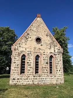 Der eingezogene, quadratische Turm wurde 1871 abgerissen. Dort befand sich an der Westseite ein spitzbogenförmiges Portal. Warum die Kirchengemeinde keinen Neubau errichtete, ist bislang nicht überliefert. Die westliche Wand des Kirchenschiffs ist nur aus unregelmäßig geschichteten Feldsteinen erbaut. Dies resultiert daher, dass diese Wand ursprünglich nicht als Außenwand gedacht, sondern vom Turm verdeckt war. Eine durchgehende Lage findet der Betrachter erst auf der Höhe der Dachtraufe. Denkbar ist, dass der westliche Giebel 1871 neu errichtet wurde. Der Zugang erfolgt durch ein spitzbogenförmiges Portal, das in einen deutlich größeren, zugesetzten Spitzbogen eingelassen ist – den ehemaligen Verbindungsbogen zwischen Turm und Kirchenschiff. Darüber ist im Giebel eine kreisförmige Öffnung mit einem Dachreiter für eine Glocke am westlichen Dachfirst.