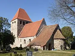 Die im Stil der Romanik um 1140 errichtete Feldsteinkirche steht auf einer westlich der Dorfstraße gelegenen Höhe, umgeben von einem Friedhof. Einem Saalbau sind im Osten Chor und Apsis und an der Westseite ein massig wirkender Querturm angefügt (Vollständige Anlage). Der in seinem Mauerwerk Risse aufweisende Turm wird von Norden und Westen durch äußere schwere Strebepfeiler gestützt. Das wahrscheinlich später aufgesetzte Glockengeschoss ist mit rundbogigen Schallöffnungen versehen, die zum Teil ganz oder nur im unteren Drittel vermauert sind. Der Turm wird durch ein Walmdach bekrönt. Das fensterlose Erdgeschoss des Turms ist weder von außen noch von innen zugänglich. In der Westwand des ersten Turm-Obergeschosses ist eine jedoch vermauerte Eingangstür zu erkennen. Im Inneren ist an der Tür noch die Sperrbalkenvorrichtung zu erkennen. Heute ist der Turm durch ein Rundbogenportal von der Orgelempore zu erreichen.
