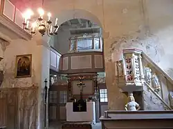 Im Innern befindet sich eine zweiseitige doppelte Empore, die im oberen Teil als Herrschaftsloge diente. Die Empore weist ebenso wie die Orgel klassizistische Formen auf. In einem bemalten Schrein aus dem 15. Jahrhundert ist eine Vespergruppe aufgezeichnet. Die geschnitzte Kanzel stammt aus der Zeit um 1635. Sie besteht aus einem achtseitigen, von einem Engel getragenen Korb mit Christus Salvator und einem Wappen. An der Brüstung des Aufgangs zum Korb befinden sich Darstellungen der Evangelisten.