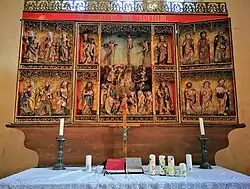 Besonderes Ausstattungsstück ist ein gotischer Flügelaltar mit geschnitzten Figuren, der im Mittelteil eine Kreuzigungsszene, oben links die Darstellung der Dreieinigkeit, darunter Johannes der Täufer, rechts oben den Heiligen Laurentius, darunter Anna selbdritt zeigt. In den Flügeln des Altars sind die zwölf Apostel dargestellt.