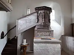 Im Innern sind ein Priechengestühl und eine Hufeisenempore aus der Zeit um 1650 sowie ein Kanzelaltar, vermutlich aus Anfang des 18. Jahrhunderts, zu sehen. Die eingefügte Kanzel, bereits Anfang des 17. Jahrhunderts entstanden, ist mit schönem Beschlagwerk zwischen toskanischen Ecksäulchen versehen. Eine Sakramentsnische stammt aus der Zeit der Spätgotik.