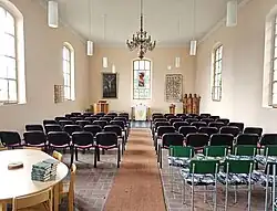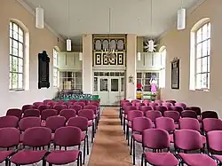 Im Innenraum wird der Dachturm von zwei massiven Pfeilern abgestützt, zwischen denen auf der Empore die Orgel steht. Das Werk mit sieben Registern auf zwei Manualen und Pedal wurde 1911 von Wilhelm Rühlmann hinter den Prospekt eines unbekannten Orgelbauers aus dem 19. Jahrhundert gebaut.[1][2]
