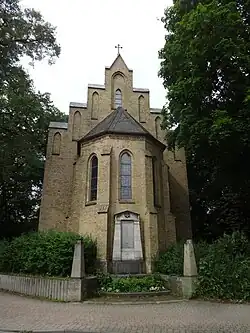 Das gesamte Bauwerk wurde aus gelblichem Backsteinmauerwerk errichtet. Der Chor ist stark eingezogen und hat einen Fünfachtelschluss. An der östlichen Wand steht ein steinerner Gedenkstein für die Gefallenen aus dem Ersten Weltkrieg, der in Anlehnung an eine Ädikula gestaltet wurde. Darüber ist an den fünf sichtbaren Seiten der Apsis je ein spitzbogenförmiges Fenster zwischen zweifach gestuften Strebepfeilern.