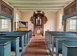 Im Innenraum befindet sich eine Hufeisenempore aus dem 18. Jahrhundert. An deren Brüstung wurden Bilder aus dem Anfang des 20. Jahrhunderts angebracht. Der Altaraufsatz stammt vermutlich aus der Bauzeit der Kirche. Er wurde nachträglich zu einem Kanzelaltar umgebaut. Unterhalb des Korbes befindet sich ein Gemälde, das das Abendmahl Jesu zeigt. Es stammt aus dem Ende des 19. Jahrhunderts. Der Korb steht zwischen zwei Säulen die mit Akanthuswangen verziert sind, darüber sind Putten und eine Sonne angebracht.