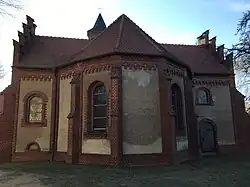 Das Bauwerk wurde im Wesentlichen aus Mauersteinen errichtet, die flächig verputzt wurden. Der Chor ist nicht eingezogen und hat einen Fünfachtelschluss. Während die Scheitelwand geschlossen ist, befindet sich in den beiden angrenzenden Feldern je ein großes Rundbogenfenster mit einem Gewände aus Mauerstein. Dazwischen ist je ein zweifach getreppter Strebepfeiler sowie am Übergang zum Dachfirst ein nach unten geöffneter Zahnfries aus rötlichem Mauerstein. Das Dach ist mit Biberschwanz gedeckt.