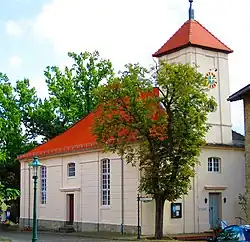 Die verputzte Saalkirche wurde 1775 erbaut. Sie besteht aus einem Langhaus, das mit einem Walmdach bedeckt ist, aus dem sich im Westen ein Dachturm erhebt, der mit Lisenen und Gesimsen gegliedert und mit einem Pyramidendach bedeckt ist.