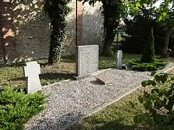 Das Gelände ist von einer Ziegelsteinmauer eingefriedet. Ein Denkmal erinnert an die Gefallenen aus dem Zweiten Weltkrieg, ein Findling an den Heimatdichter Hermann Thomas (1855–1931).