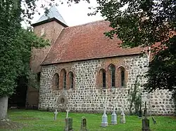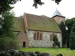 Die Dorfkirche Gägelow ist ein sorgfältig ausgeführter einschiffiger Feldsteinbau aus dem dritten Viertel des 13. Jahrhunderts mit eingezogenem Chor auf quadratischem Grundriss mit einem Backsteingiebel ähnlich demjenigen der Dorfkirche Ruchow. Die ehemalige Sakristei auf der Südseite wird als Grabkapelle der Familie von Bülow genutzt und besitzt einen Giebel aus Backstein mit dreifachem Zahnfries.[17] Der barocke Westturm aus Backsteinen und mit Schiefer eingedeckten kurzen Pyramidenhelm entstand vermutlich im Jahr 1796[18] als Ummauerung eines älteren hölzernen Turms[19] und verdeckt teilweise den Westgiebel mit steigendem Rautenfries. Die Backsteine haben eine Abmessung von 26 cm × 13 cm × 9,5 cm. Der Chorgiebel zeigt über doppeltem Zahnfries ein großes Blendenkreuz mit zu Dreiergruppen gekuppelten Blenden und an den Schrägen einen ansteigenden Spitzbogenfries. An der Nord- und Südseite des Schiffs sind je zwei Lanzettfenster mit schrägen Laibungen zu Dreiergruppen zusammengefasst, wobei das mittlere Fenster im Scheitel höher liegt als das äußere. Der Chor besitzt auf seiner Ostseite eine dreiteilige und an der Süd- und Nordseite eine zweiteilige Fenstergruppe, letztere wurde durch den Nordanbau von außen geschlossen. Die beiden spitzbogigen Portale des Schiffs mit abgetreppten Gewänden sind vermauert. Im Norden ist eine Vorhalle aus Backstein angebaut, die wohl aus dem 18. Jahrhundert stammt.