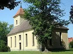 Die klassizistische Saalkirche aus verputzten Feldsteinen wurde 1823–25 erbaut. Aus ihrem Satteldach ihres Langhauses, das im Osten abgewalmt ist, erhebt sich im Westen ein quadratischer Dachturm, der mit einem Pyramidendach bedeckt ist. Das Portal befindet sich in einem schwach ausgeprägten Risalit an der Südwand des Langhauses.