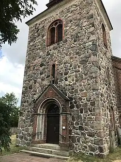Der Kirchturm ist in seinem Grundriss quadratisch und gegenüber dem Schiff eingezogen. An seiner Westseite ist ein großes, dreifach getrepptes Portal von 1865/1867 mit einem betonten Kämpfer und Giebel mit Kreuzblume. An der Nord- und Südseite ist jeweils ein kleines Rundbogenfenster mit einer Laibung aus Mauerstein. Im mittleren Geschoss ist je eine hochrechteckige Öffnung, gefolgt vom Glockengeschoss. Dort sind an der Westseite zwei, an der Nord- und Südseite jeweils eine Klangarkade. Darüber ist ein Pyramidendach, das in einen verschieferten Aufsatz mit weiteren Klangarkaden führt. Er schließt mit einer geschwungenen Haube und einer Spitze ab; darauf sitzt eine Turmkugel mit Wetterfahne und Stern.