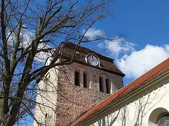 Der Westturm ist rund 6,85 Meter lang und rund 11,20 Meter breit. Sein Mauerwerk ist sehr unregelmäßig. An der Südseite ist ein Schlitzfenster erkennbar, an der Nordseite ein Rundbogenfenster. Weiterhin verfügt er an diesen Seiten über je eine gekuppelte, zweifach abgetreppte Klangarkade. Oberhalb des querstehenden Mansarddaches befindet sich eine Wetterfahne mit der Jahreszahl 1906.