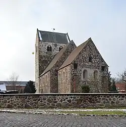 Die Kirche ist eine romanische Saalkirche aus Feldsteinmauerwerk mit eingezogenem, quadratischem Chor und Westquerturm, die dendrochronologisch auf die Zeit um 1226 (d) datiert wurde. An der Südseite ist ein abgetrepptes Rundbogengewände mit Kämpfergesims, Rundbogenportale sind an der Westseite und an der Nordseite (vermauert) sowie als verschlossene Priesterpforte an der Südseite des Chores zu finden. Am Chor sind noch die romanischen Fensteröffnungen erhalten. Am Turm sind gekuppelte spitzbogige Schallöffnungen aus Backstein in spitzbogigen Blenden aus Feldstein eingelassen. Korbbogenfenster und Kreisfenster zur Belichtung des Raums unter der Orgelempore stammen vom Umbau der Jahre 1815/16 und 1909/10. Eine Restaurierung des Altars und der Kanzel wurde 2018 vorgenommen.[1]