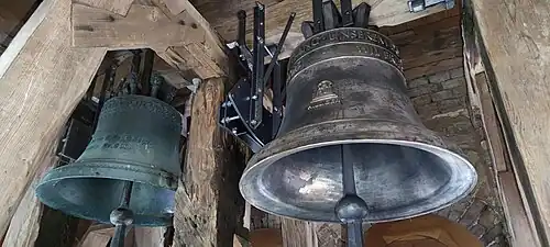 Im Turm hingen zwei Glocken von 1880, die in der Glockengießerei von Carl Voß und Sohn in Stettin gegossen wurde. Wie bei vielen Kirchen in Deutschland wurde im Zweiten Weltkrieg eine der zwei Glocken abgenommen und eingeschmolzen – für Bomben und Kanonen.[2][3][4]