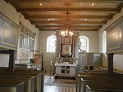 Der schlichte Kanzelaltar stammt ausweislich einer Inschrift aus dem Jahr 1782. Er besteht unter anderem aus einem polygonalen Kanzelkorb, der zwischen Säulen aufgestellt ist. Zur weiteren Kirchenausstattung gehört ein Ölgemälde, das die Drei Marien am Grab von Jesus Christus zeigt. Der Maler Bernhard Rode schuf das Werk gegen Ende des 18. Jahrhunderts. Das Gestühl sowie die Hufeisenempore wurden ebenfalls 1782 angefertigt. Bei den Renovierungsarbeiten 1997 legten Experten einige Putzmalereien frei. Das Bauwerk ist in seinem Innern flach gedeckt. Die Bemalung stammt aus der Mitte des 19. Jahrhunderts und wurde 2004 freigelegt.