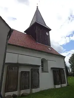 An der Westseite ist eine kleine, querrechteckige Turmvorhalle mit einem segmentbogenförmigen Portal sowie zwei kleinen Fenstern an der Nord- und Südseite. Sie sind in eine Blende eingelassen, die am oberen Rand mit einem Fries verziert ist. Seitlich des Giebels sind zwei angedeutete Fialen mit einem eingelassenen Kreuz. Der Anbau hat ebenfalls ein Satteldach. An der westlichen Wand des Kirchenschiffs steht links und rechts der Vorhalle je ein weiteres Epitaph. Der quadratische und verbretterte Kirchturm erhebt sich aus dem Kirchenschiff. An der Nord- und Südseite ist in westlicher Richtung eine Turmuhr, östlich eine Klangarkade. An der Nord- und Südseite ist ebenfalls mittig eine weitere, kleine Klangarkade. Daran schließt sich der Turmhelm mit Turmkugel und Wetterfahne an.