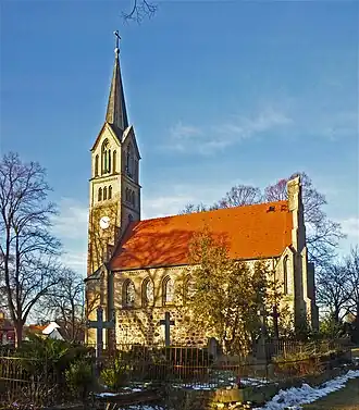 Im Turm hängen zwei Glocken, von denen eine aus der Glockengießerei C. Voss und Sohn aus Stettin stammt. Sie wurde 1873 hergestellt. Die zweite Glocke wurde 1964 in der Glockengießerei in Apolda gegossen.