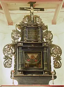Der Altar zeigt geschnitzte Wangen und ein Kruzifix als Krönung. Das Altarbild fand man auf dem Dachboden der Kirche. Es wurde 1935 restauriert und an seinen Bestimmungsort zurückgebracht. Auf dem Altarbild ist das Jüngste Gericht mit Christus als Weltenrichter dargestellt.